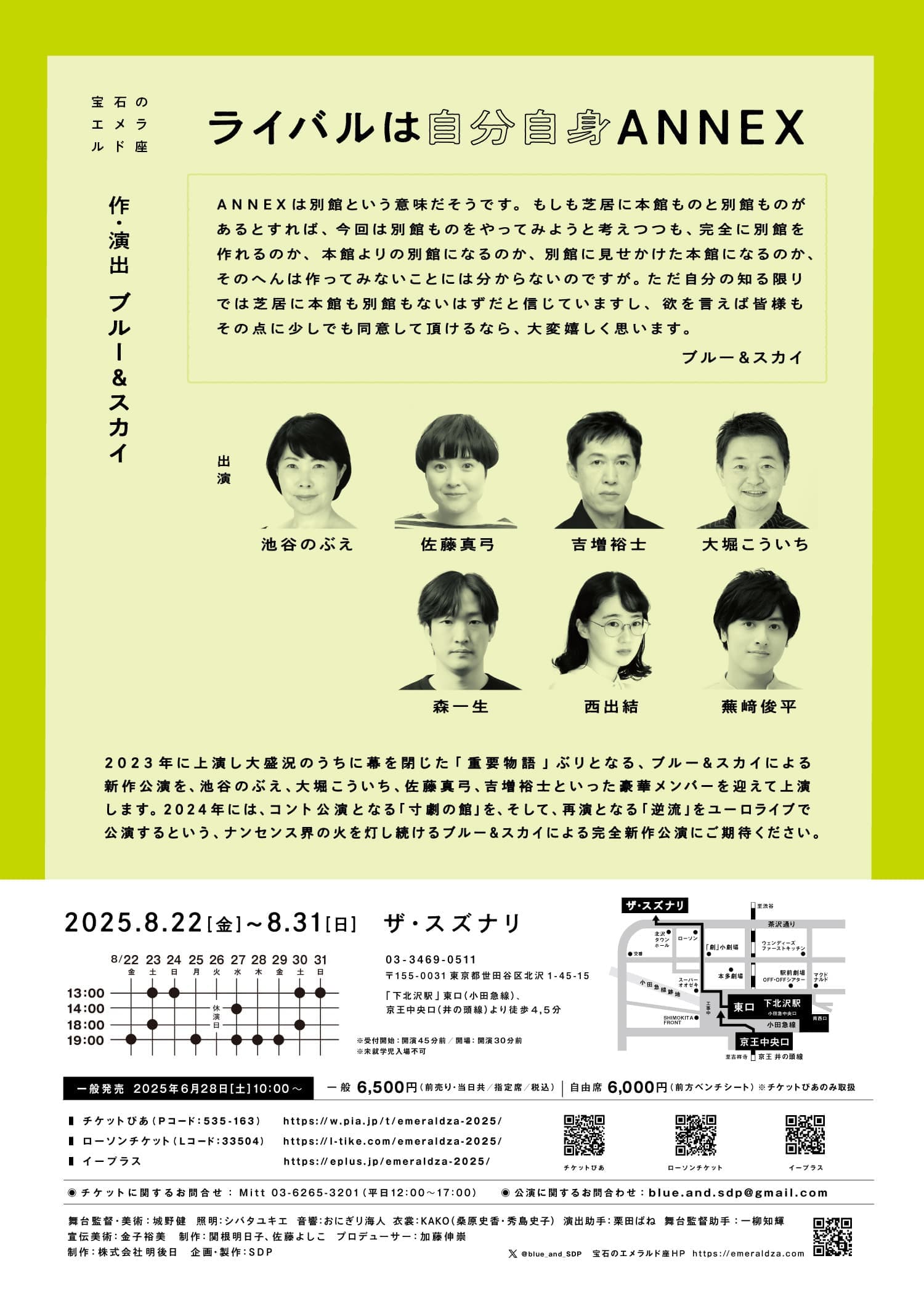 ANNEXは別館という意味だそうです。もしも芝居に本館ものと別館ものがあるとすれば、今回は別館ものをやってみようと考えつつも、完全に別館を作れるのか、本館よりの別館になるのか、別館に見せかけた本館になるのか、そのへんは作ってみないことには分からないのですが。ただ自分の知る限りでは芝居に本館も別館もないはずだと信じていますし、欲を言えば皆様もその点に少しでも同意して頂けるなら、大変嬉しく思います。